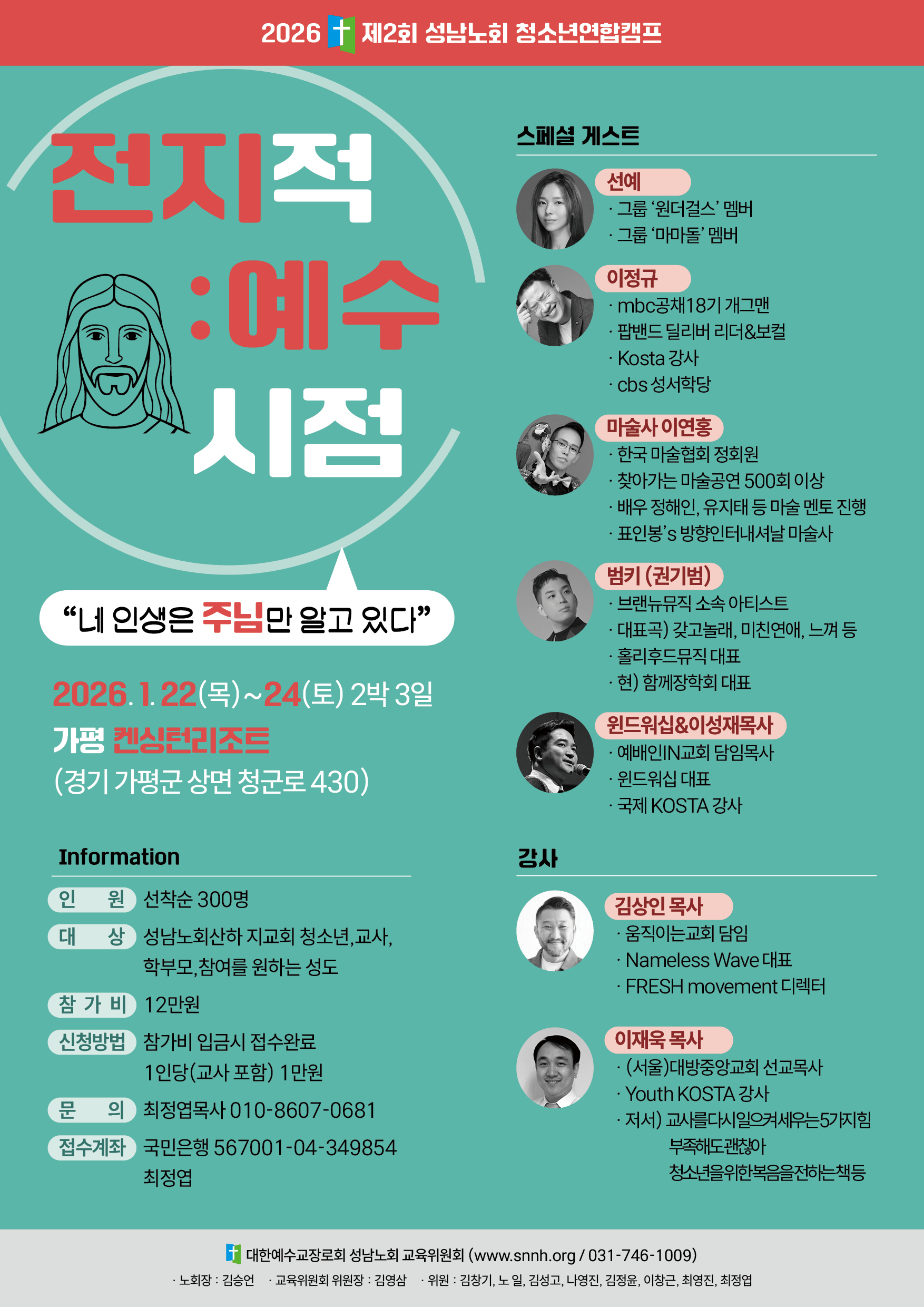 중고등부 학생들이 수련회에 참여합니다. 0 120 01.17 16:53 일시 : 2026년 1월 22일(목)~24일(토) 장소 : 가평켄싱턴리조트주제 : "네 인생은 주님만 알고 있다"성남노회 교육위원회에서 주최하는 연합수련회에 참여합니다. 주님을 만나서 넘치는 은혜를 받고 세상으로 돌아와 세상을 비추는 빛으로 살아가도록 기도해주세요.